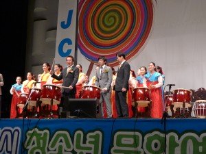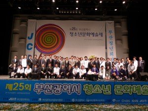 昨日は山本常務と共に、朝の便で釜山へ。空港には釜山JCメンバーが迎えに来てくれ、釜山JCが事業をおこなう会場へと向かった。着くと、昨日から韓国入りしていた青柳副理事長、そして南部委員会のメンバーの姿もあった。その事業とは青少年文化芸術祭という素晴らしき事業である。今年で第25回目を迎えるその事業は、釜山市内における孤児院のこども達が楽器の演奏や踊りなどを各施設ごとに披露するもので、会場前には彼らが描いた絵であったり、写真の作品展示などもされてあった。会場には多くの観客でいっぱいであり、いよいよ盛大に芸術祭もはじまったのだが、びっくりする程に素晴らしいステージばかりであった。ここに来るまでに日々、相当な練習を踏んできたかと思うと、心が熱くなり、込み上げてくるものがあった。一生懸命に頑張っているこども達の姿は、私自身大きな感動をもらい、心が洗濯されたような気持ちとなった。私もサーカス並みの技術で縄跳びをするこども達のチームに、シム会長より声を掛けられ、下関JC中村理事長と共に急遽参加し、恥ずかしながら縄跳びに加わったりもした。また、表彰式では福岡JC理事長賞として、可愛い女児に贈呈させてもらった。