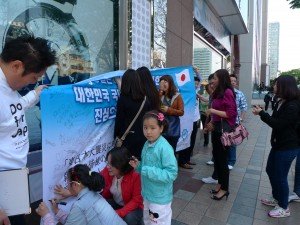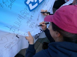 昨日はアジア誘客推進委員会の最終ミッションとして、ロッテ百貨店前にて東日本大震災の韓国の皆様からの支援に対するお礼と、震災以降に激減している韓国からの誘客の推進事業として、福岡・九州の観光PRを兼ね、ガイドブックの配布をメンバー全員でおこなった。通行される多くの方が、その横断幕に目を向けると、小さな子供から年配の方々まで多くの方々が温かいメッセージを書いてくれた。結果、横断幕の隙間が埋まってしまうほどになった。個と個の触れ合い、そして温かい心を目の当たりにした参加したメンバーは凄く感じるものがあったと思う。